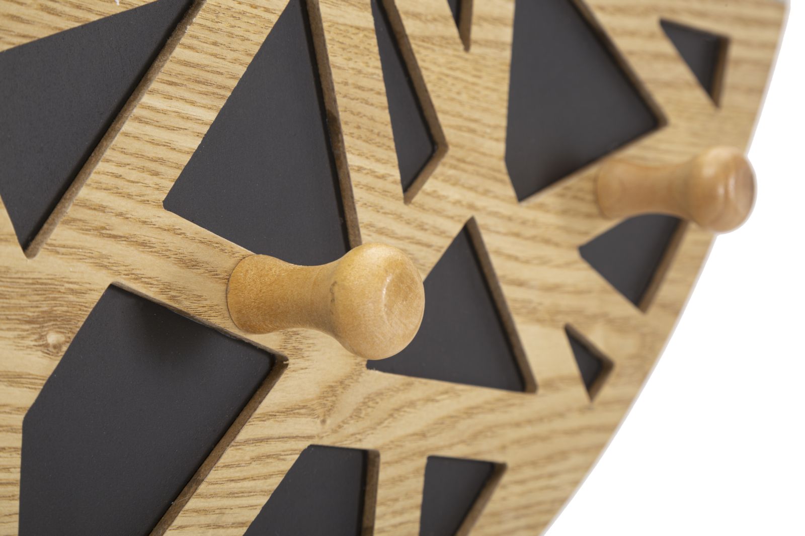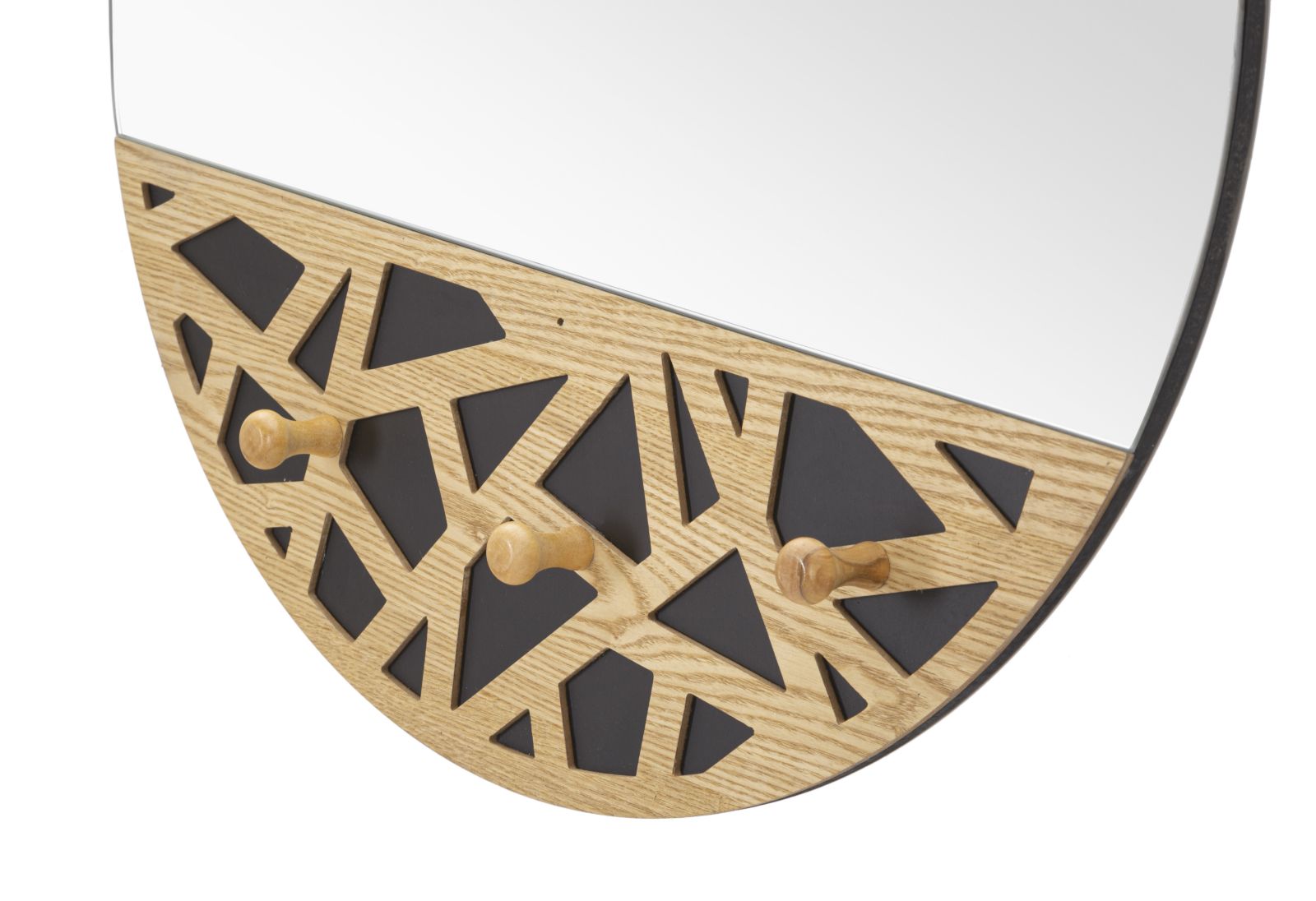 Specchio da parete con eleganti decorazioni geometriche in legno. Completo di 3 ganci appendi abiti.