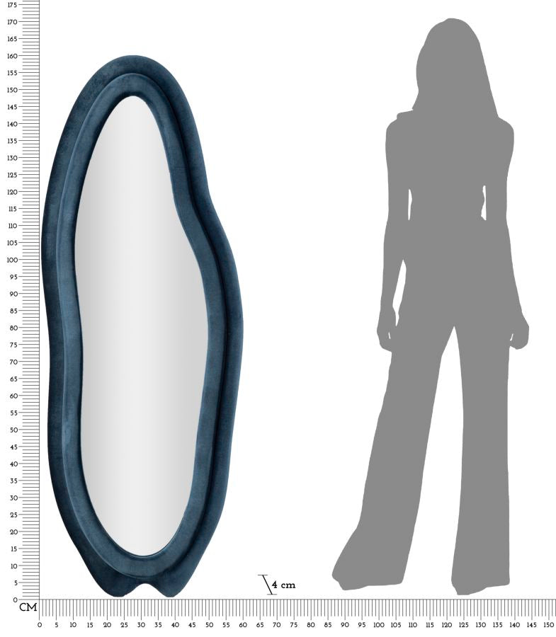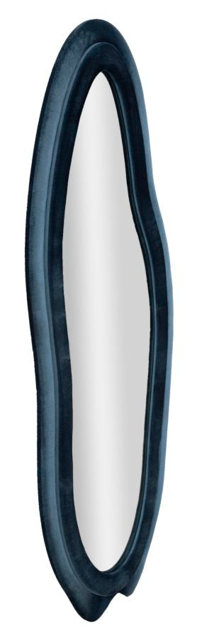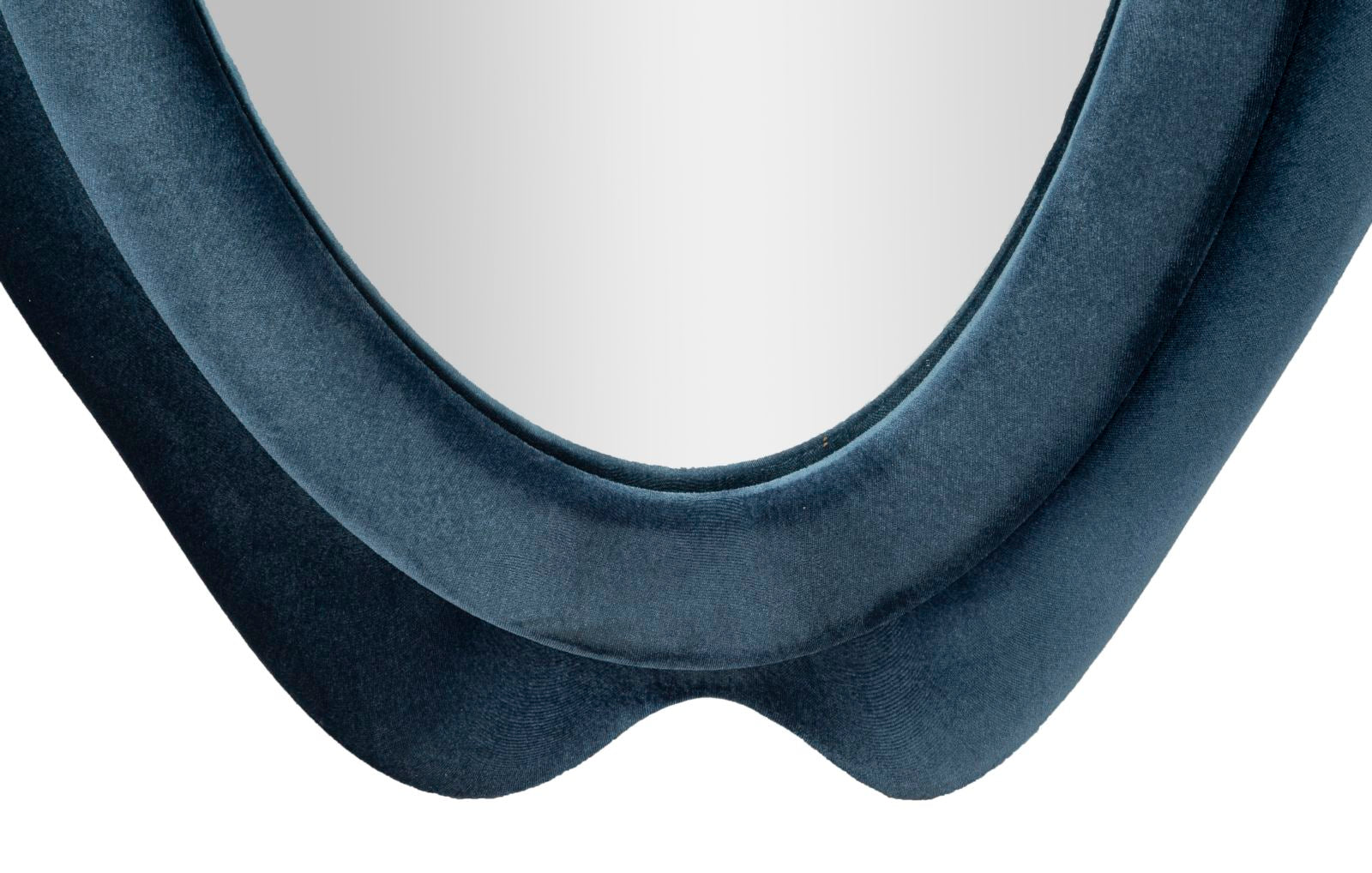 Specchio da parete con cornice in legno rivestita in velluto blu, ideale per un tocco chic e vintage nell'arredamento domestico o in ambienti dal design raffinato.