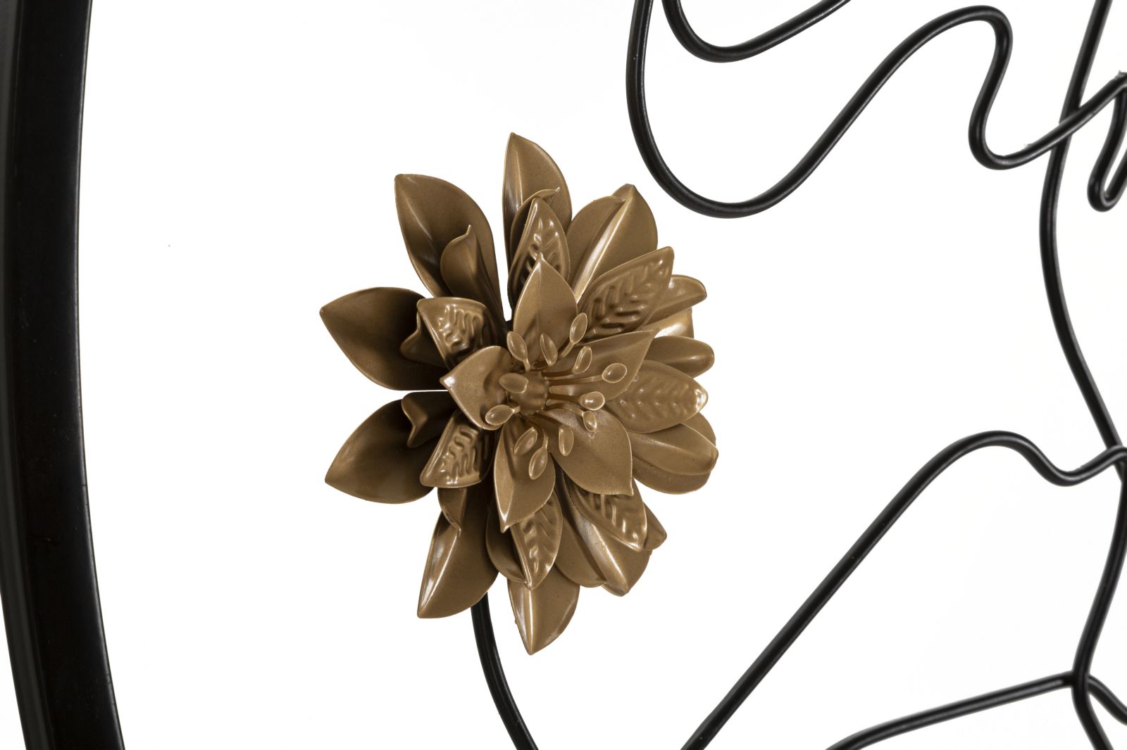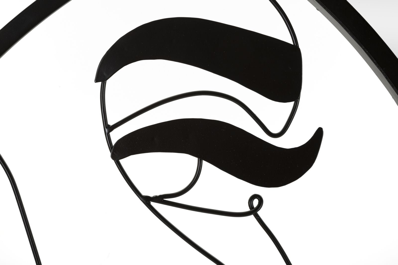 Specchio da parete a forma di mezzaluna incastonato in una struttura rotonda decorata con linee morbide che compongono un volto dai tratti che richiamano l'arte cubista.