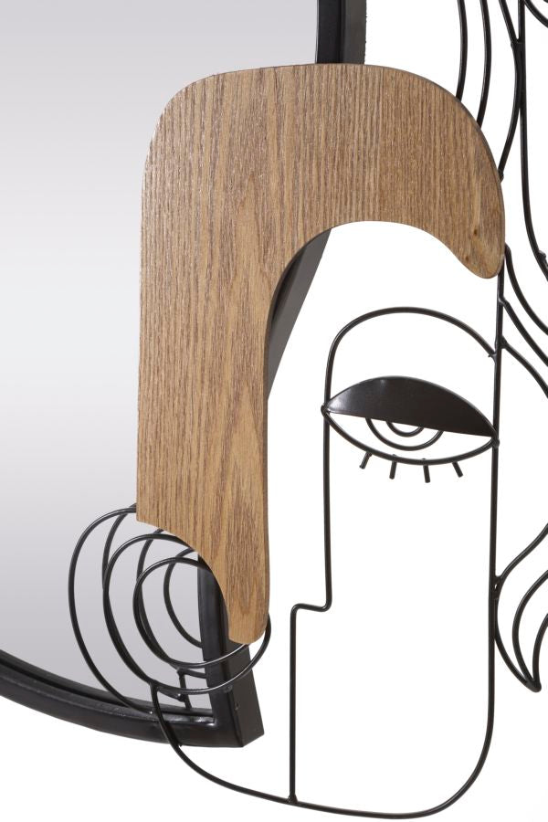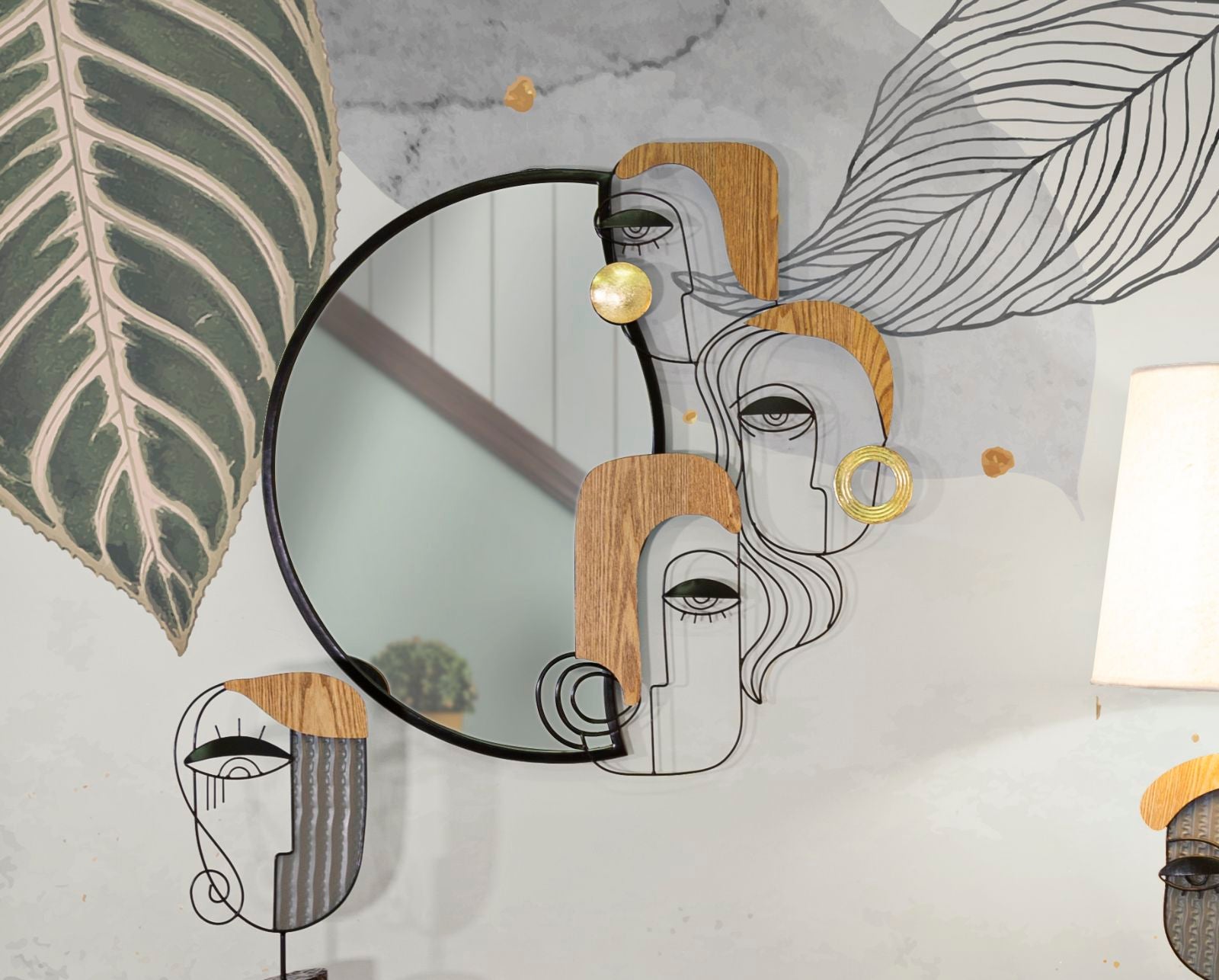 Specchio da parete con eleganti facce che richiamano l'arte cubista, realizzate con linee morbide in metallo e decorate con inserti in legno.