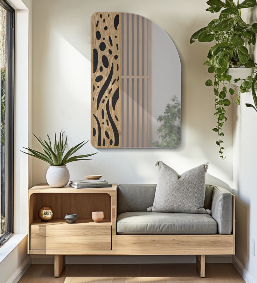 Specchio da parete con eleganti decorazioni in legno dalle forme arrotondate e morbide.