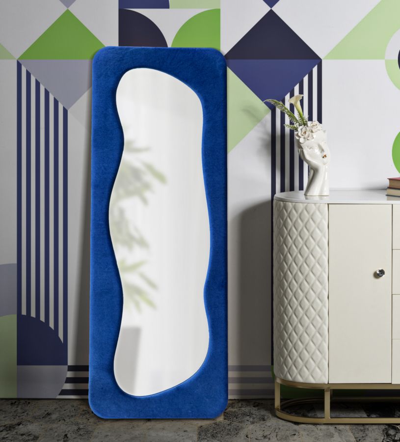 Specchio da parete con cornice in legno rivestita in velluto blu elettrico, ideale per un tocco chic e vintage nell'arredamento domestico o in ambienti dal design raffinato.