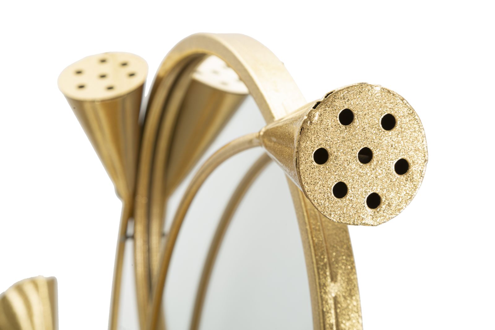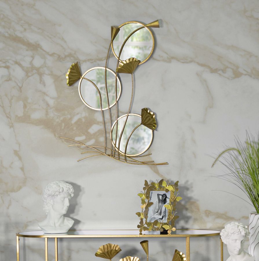 Composizione di 3 specchi rotondi da parete con cornice dorata raccordati da decorazioni composte da foglie.