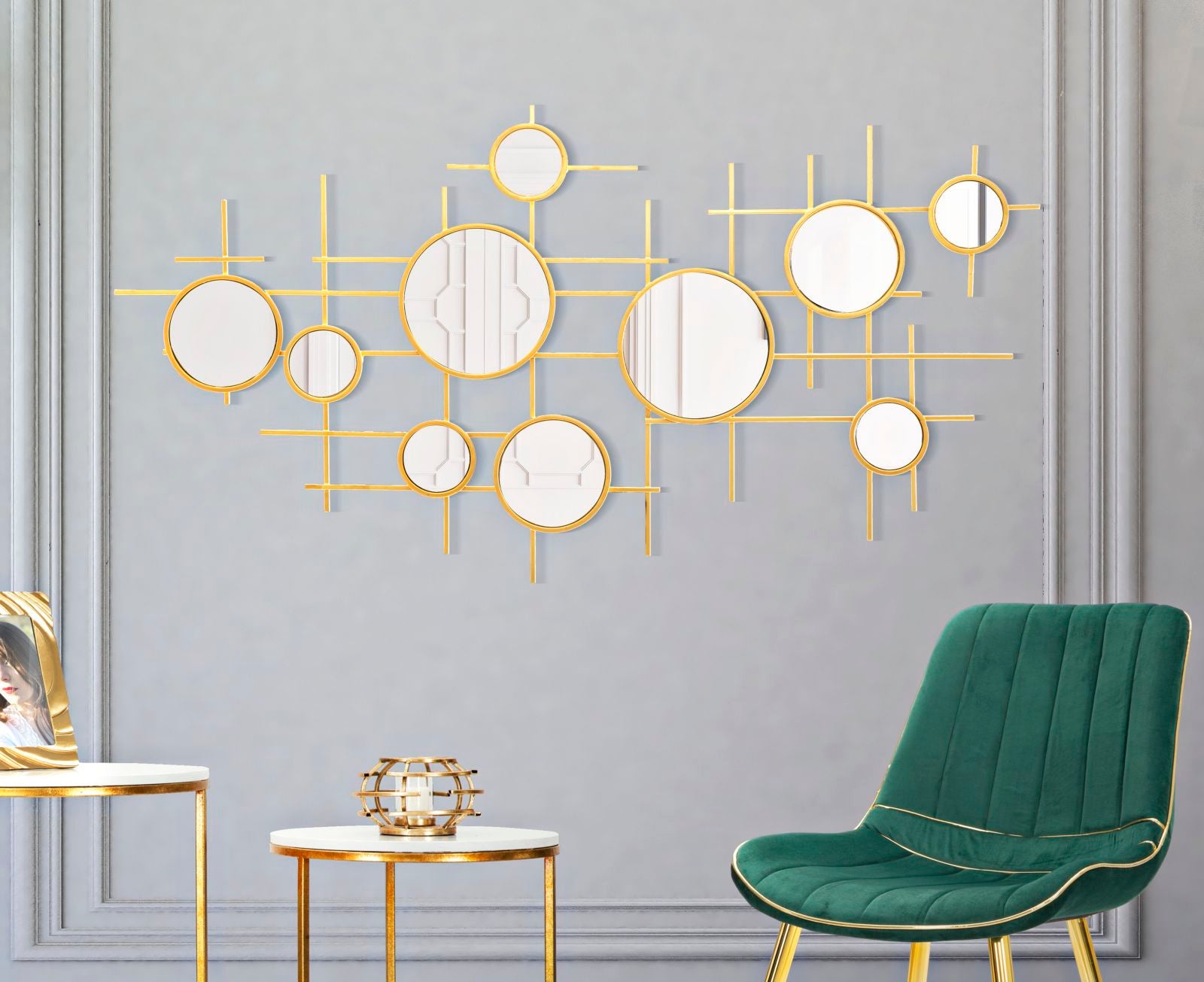 Composizione muraria con specchi rotondi di varie dimensioni collegati da decorazioni lineari e geometriche. Il colore dorato dona luminosit¨¤ ed eleganza ad ogni stanza.