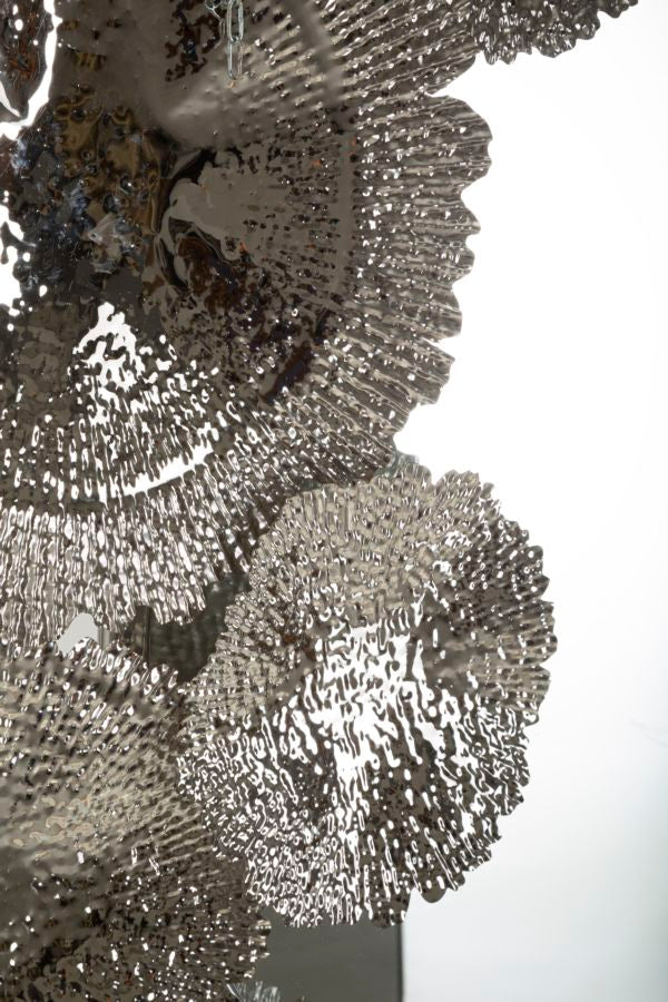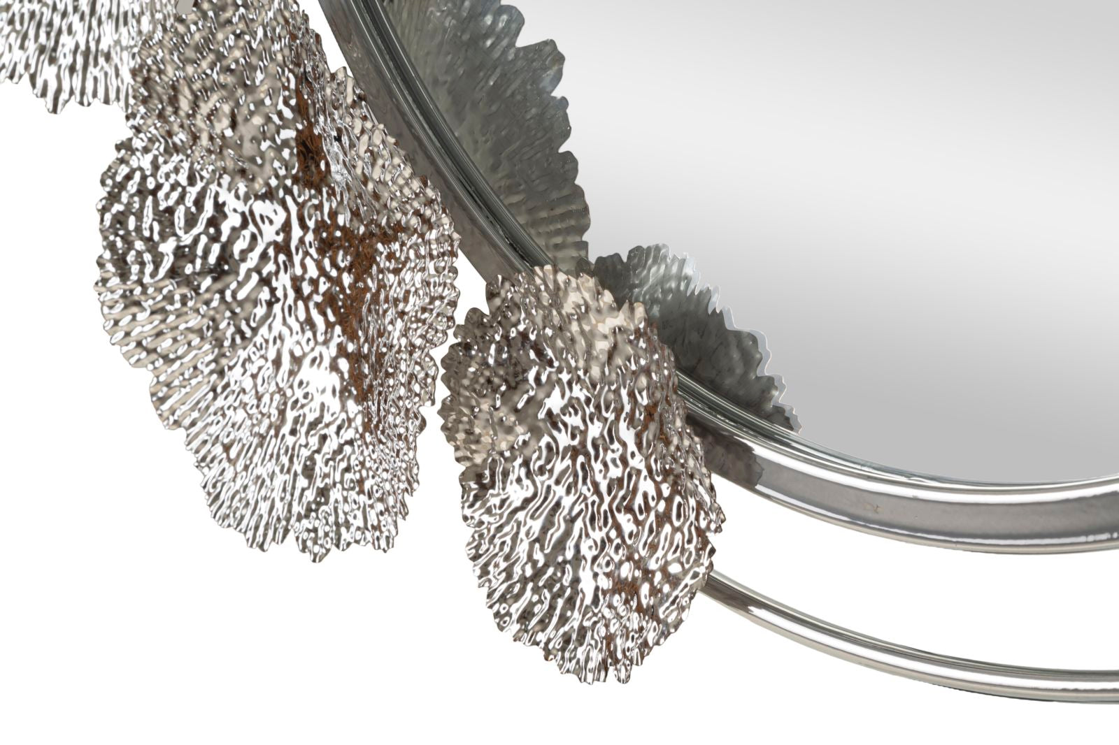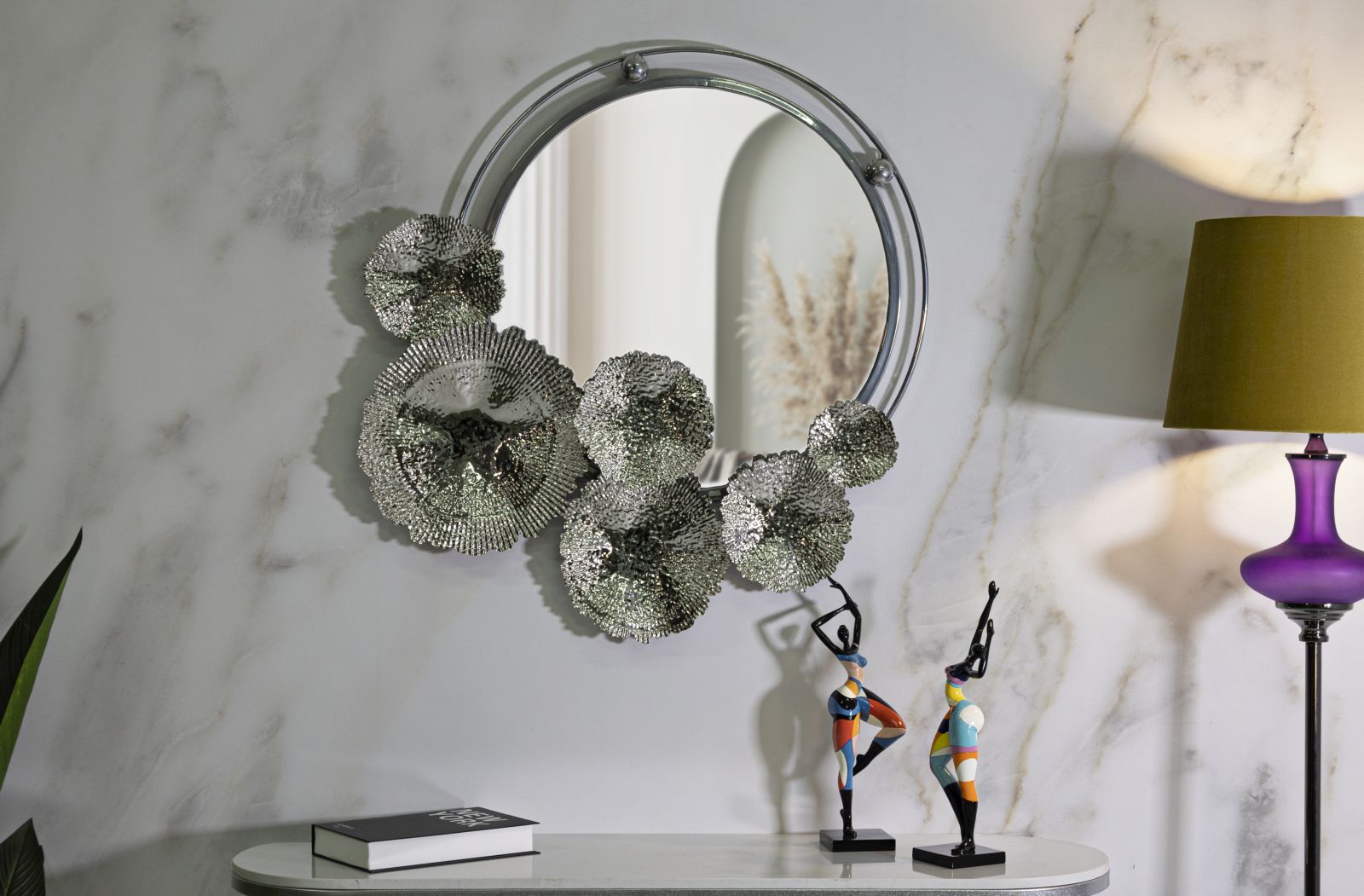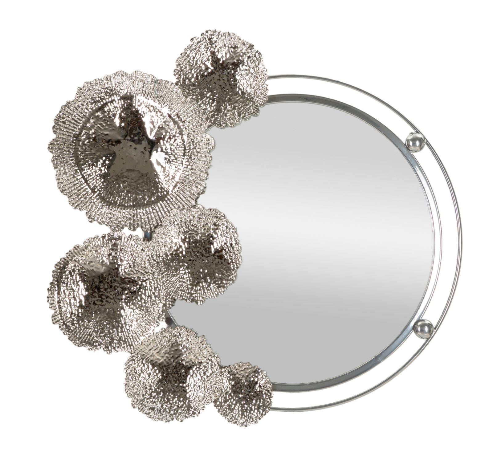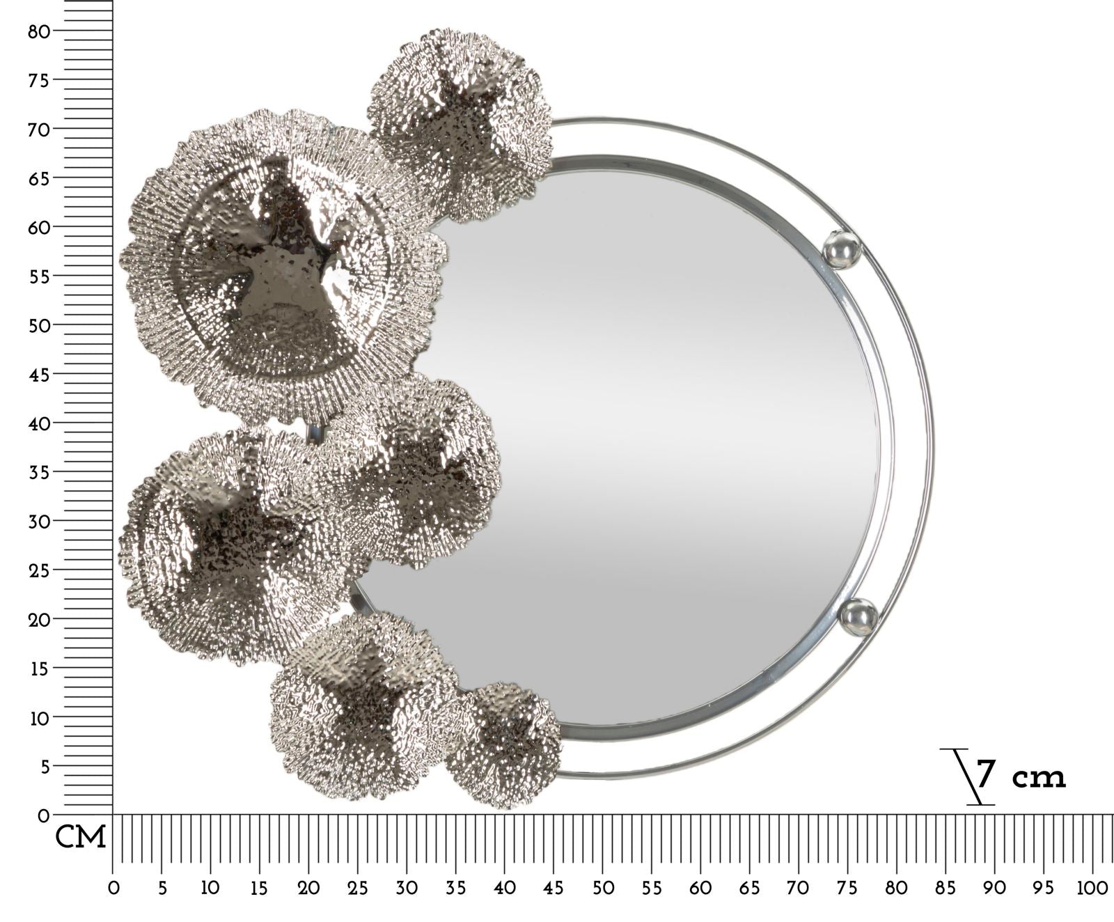 Specchio da parete in metallo ornato da applicazioni argentate che ricordano delicati fiori, aggiunge un tocco di eleganza e raffinatezza a ogni ambiente.