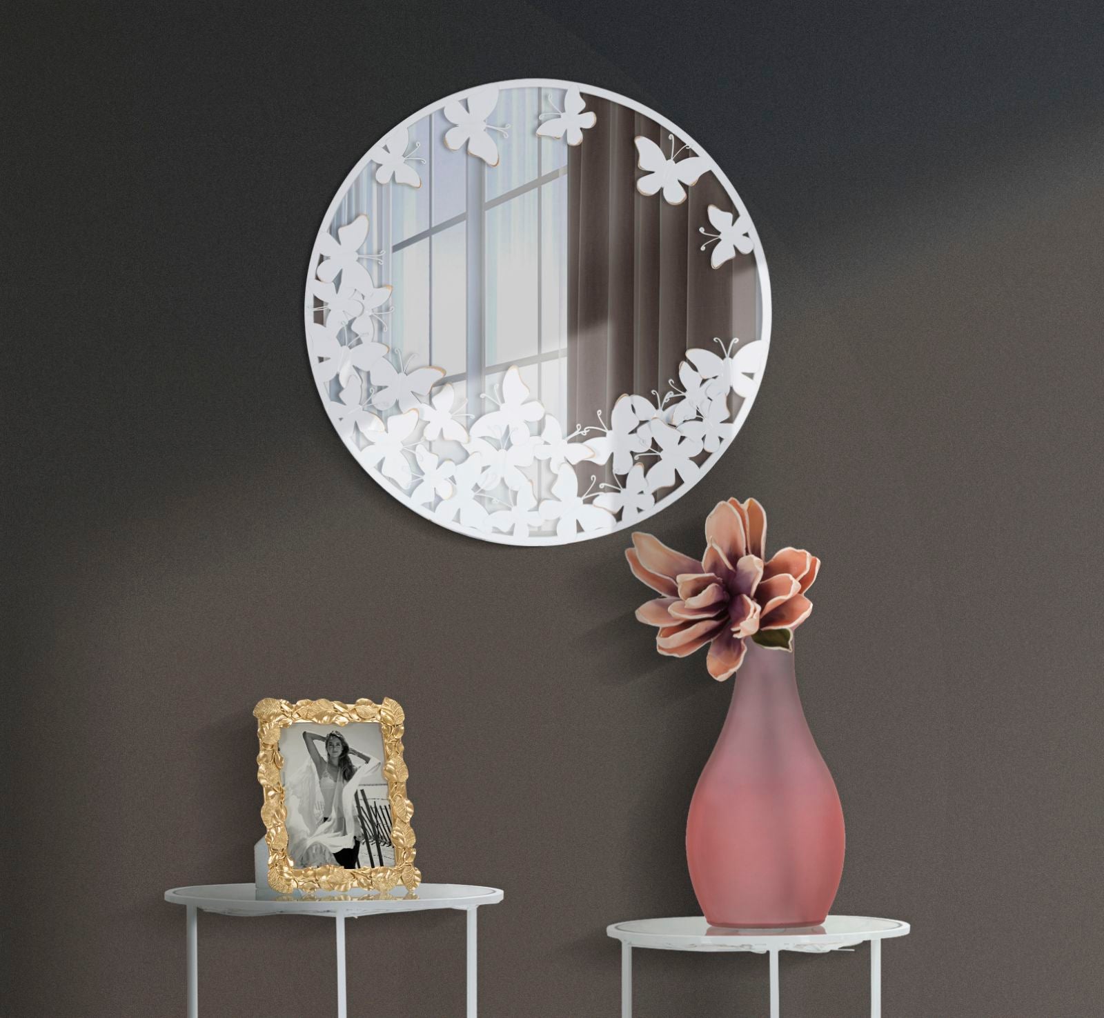 Specchio rotondo in metallo bianco con eleganti farfalle decorative con profili dorati. Gli specchi sono un elemento indispensabile per conferire luminosit¨¤ ad un arredo glamour. Allargano otticamente gli spazi e creano un sofisticato punto luce.
