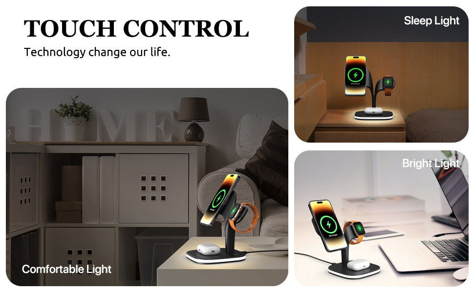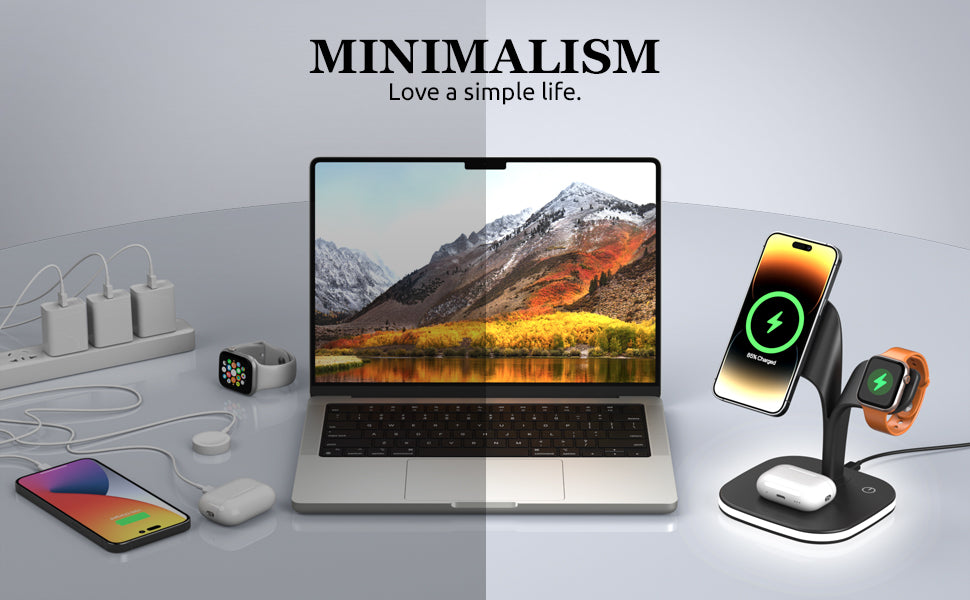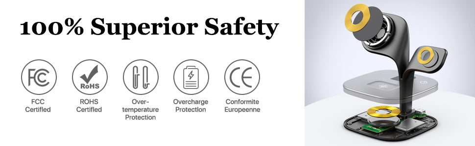 Design Magnétique et Multi-Angles:Grâce à son aimant puissant, le chargeur maintient fermement votre téléphone et votre montre. Chargez verticalement ou horizontalement pour un angle de vue parfait lors de la visualisation de vidéos ou de messages.