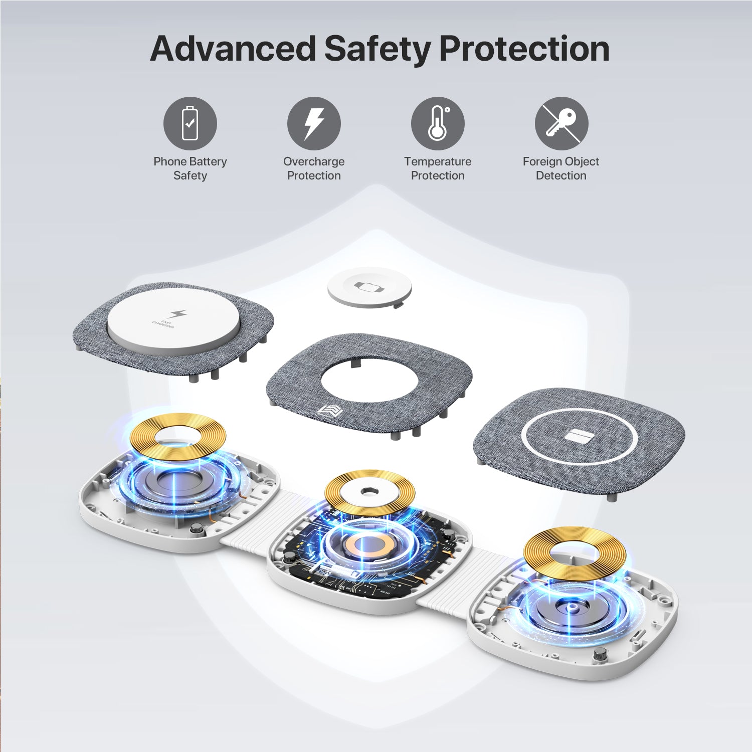 Certification Qi et Protection Maximale:Certifié Qi, ce chargeur sans fil offre une protection intelligente contre les surtensions, les courts-circuits et les surchauffes. Doté d'une feuille d'isolation magnétique professionnelle, il est sans rayonnement et sûr pour toute la famille, y compris les enfants et les personnes âgées.