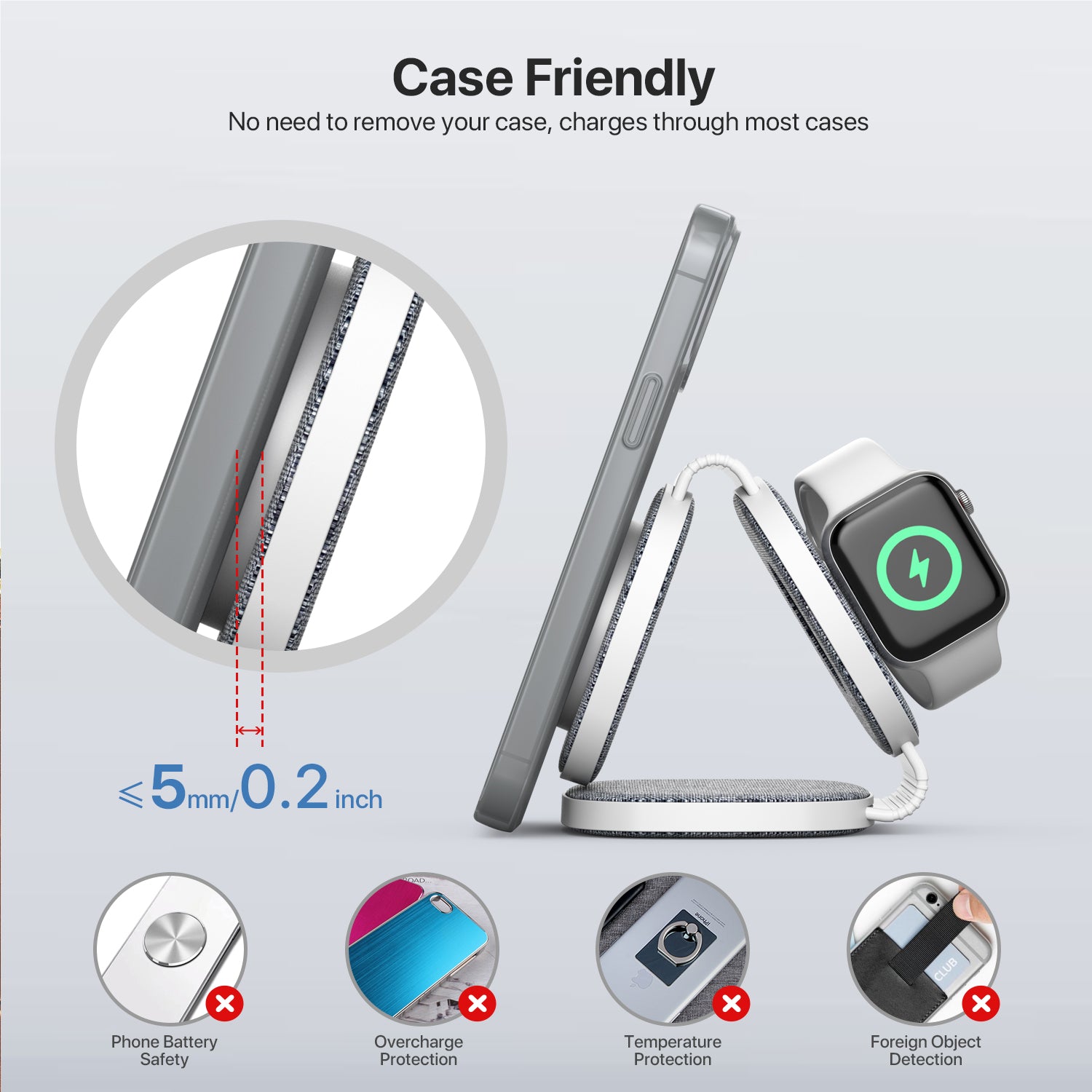 Charge Sans Fil Magnétique 3-en-1 Pratique:Ce chargeur sans fil magnétique 3-en-1 permet de charger simultanément votre iPhone et votre Apple Watch, éliminant le besoin de multiples câbles et prises. Grâce à ses aimants intégrés, il se plie en une structure triangulaire stable pour servir de support à votre téléphone (compatible avec les séries iPhone 15/14/13/12 ou les étuis magnétiques).