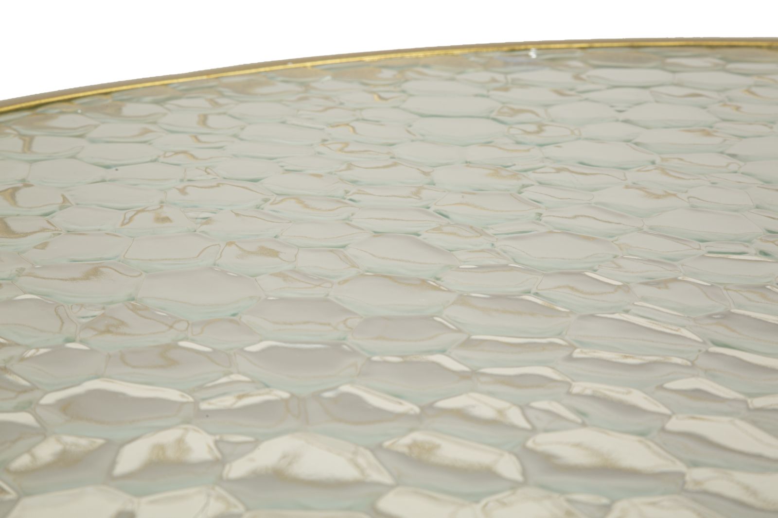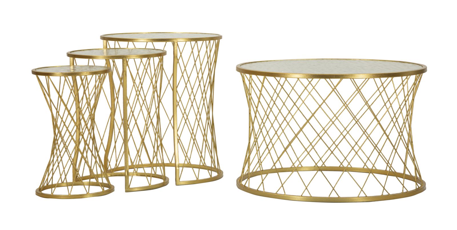 Set di 4 tavolinetti in metallo dorato con un design a rombi e top in vetro temperato. Perfetti per dare un tocco di lusso a ogni ambiente
