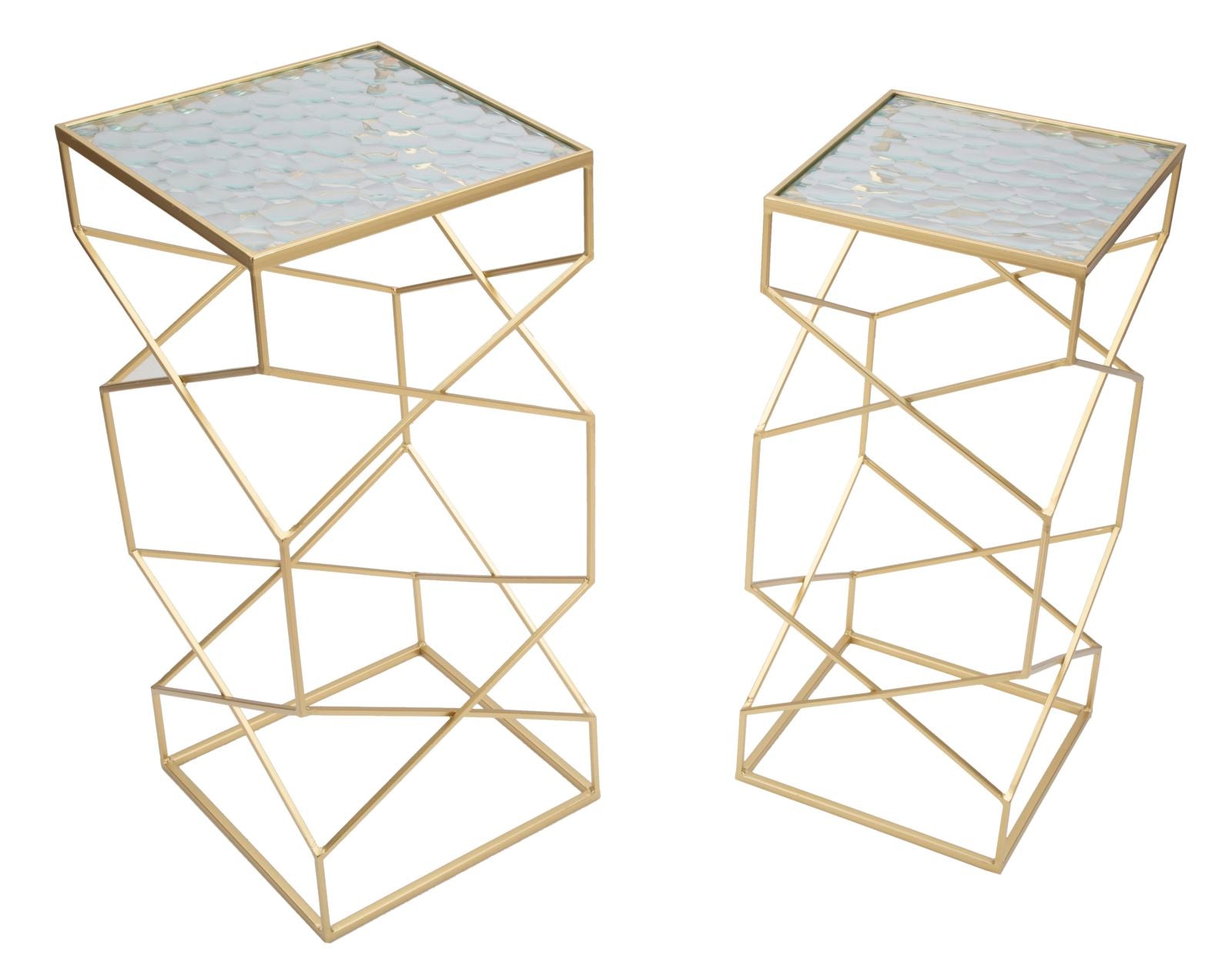 Coppia di tavolinetti quadrati in metallo dorato dalle linee geometriche che creano un senso di profondit¨¤ Completi di piano in vetro finemente lavorato.