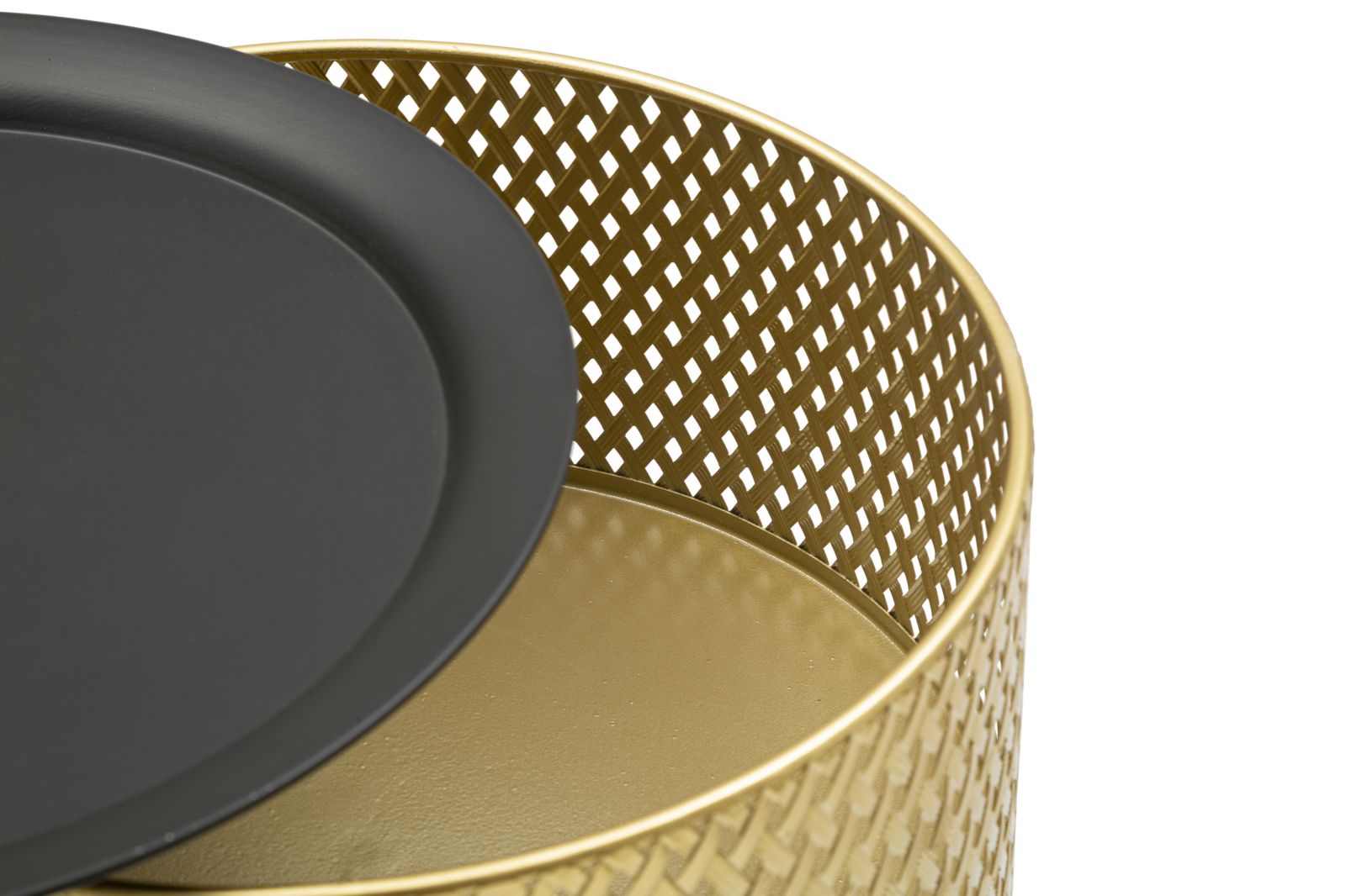 Tavolinetto rotondo in metallo dorato con piano nero. La parte superiore ¨¨ finemente decorata con intrecci per donare un tocco di eleganza. Il top ¨¨ removibile, all'interno ¨¨ presente un pratico contenitore.