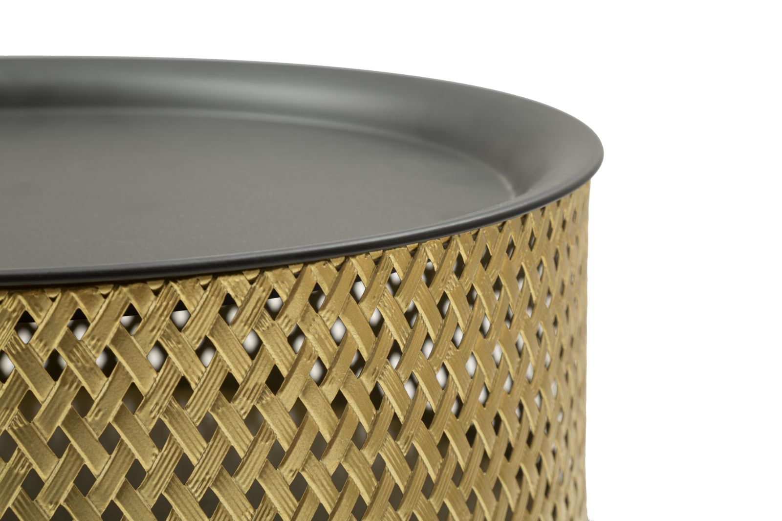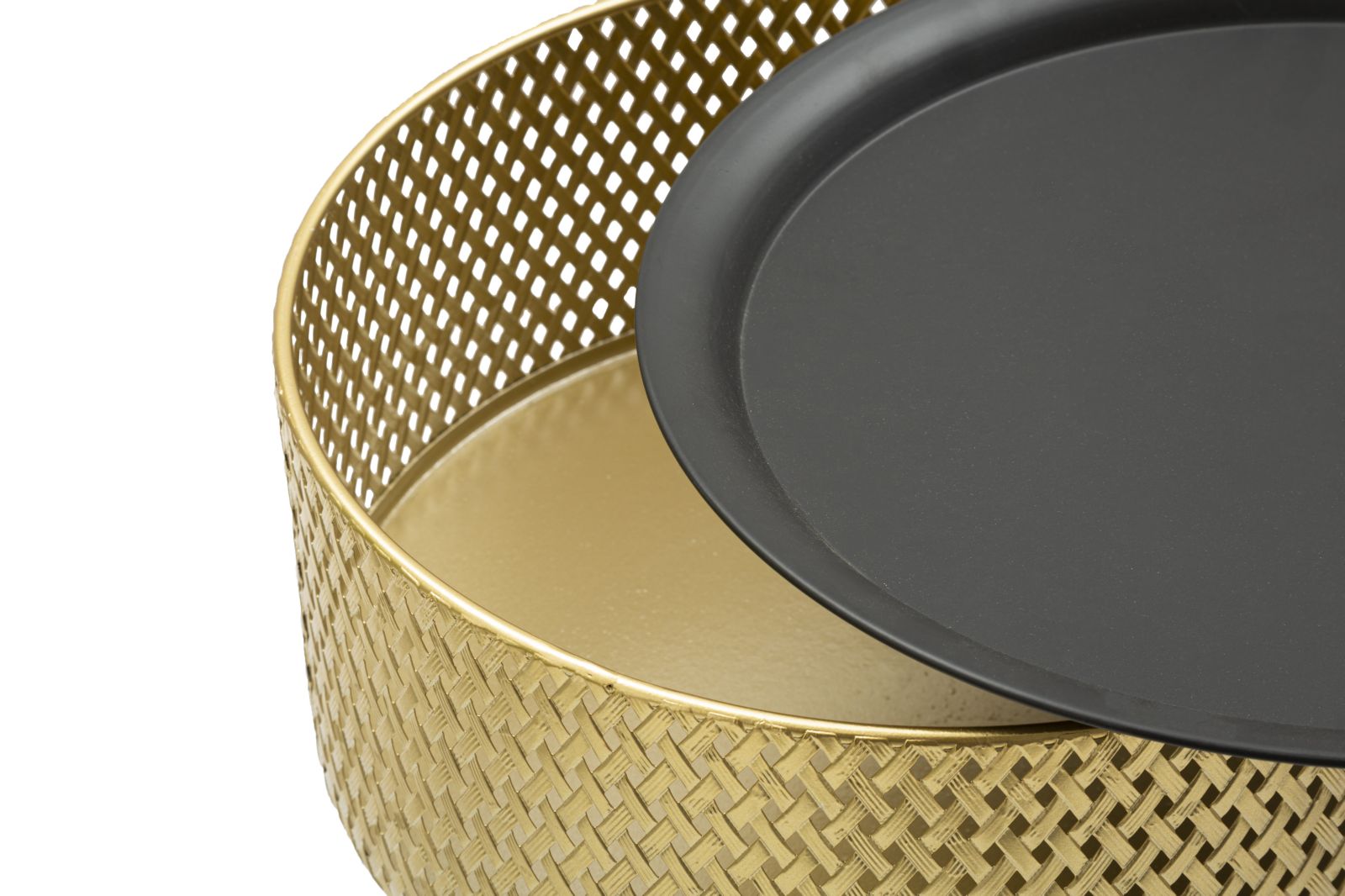 Tavolinetto rotondo in metallo dorato con piano nero. La parte superiore ¨¨ finemente decorata con intrecci per donare un tocco di eleganza. Il top ¨¨ removibile, all'interno ¨¨ presente un pratico contenitore.