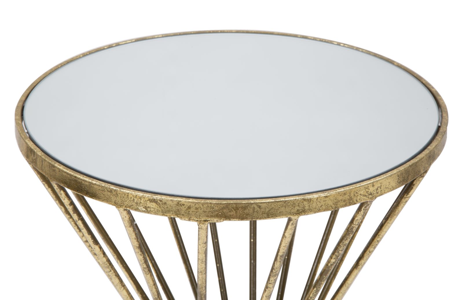 Tavolinetto rotondo in metallo e vetro. Il dorato abbinato al vetro crea un forte impatto. Un elemento lussuoso e glam per la tua casa