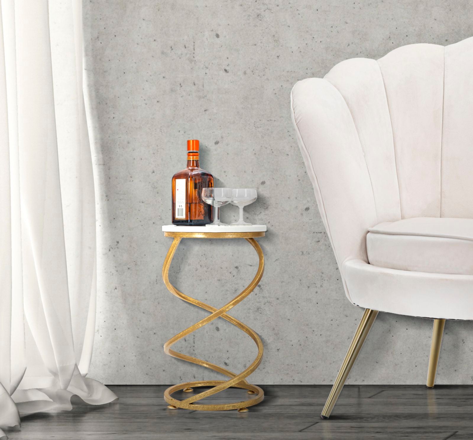Elegante tavolinetto in metallo dorato e piano in marmo bianco. Le linee dolci e sinuose creano il giusto equilibrio tra classico e glam contemporaneo.