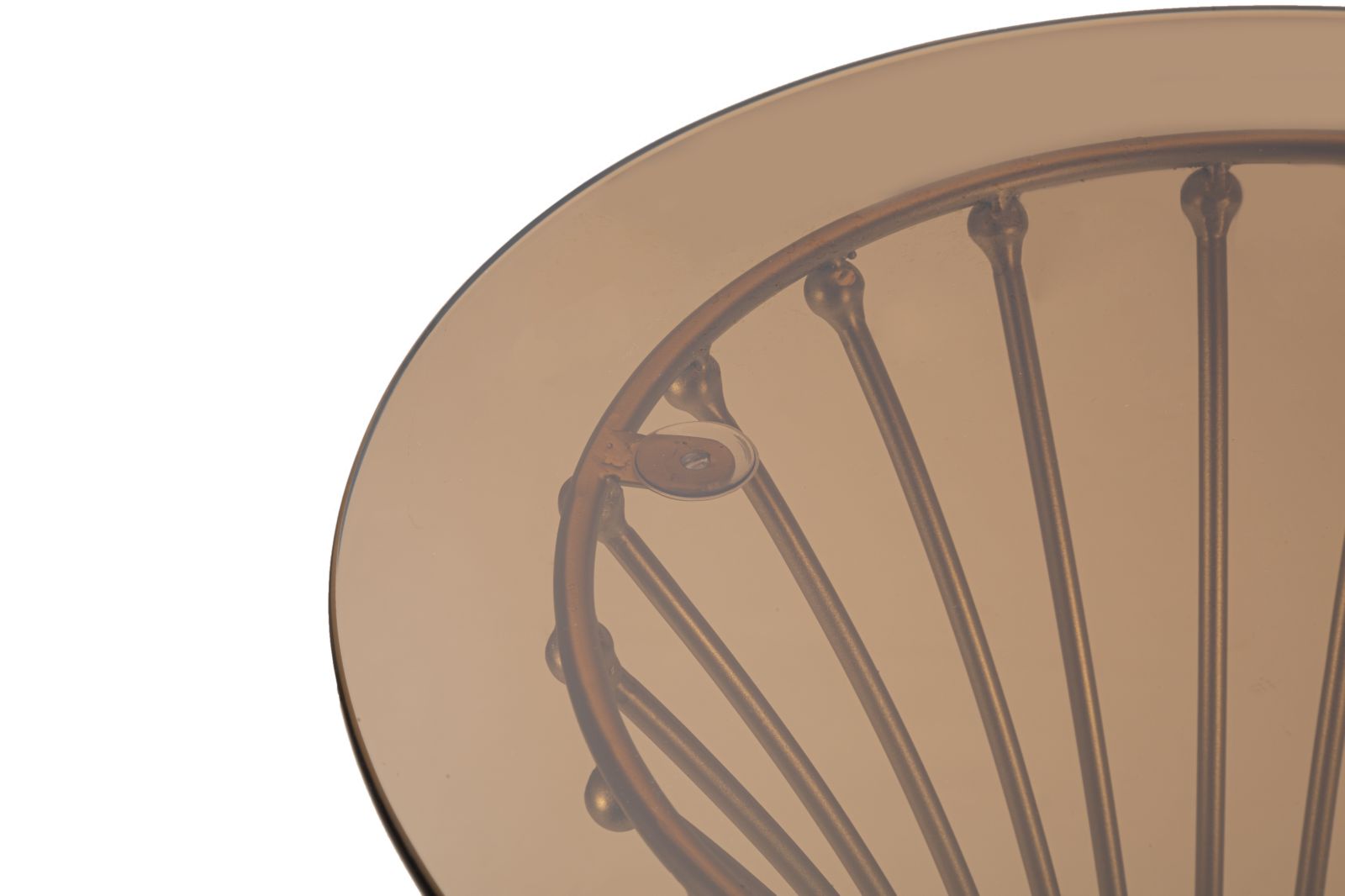 Tavolo rotondo in metallo dorato dalle linee semplici e morbide impreziosite da eleganti sfere. Completo di piano in vetro fum¨¦.