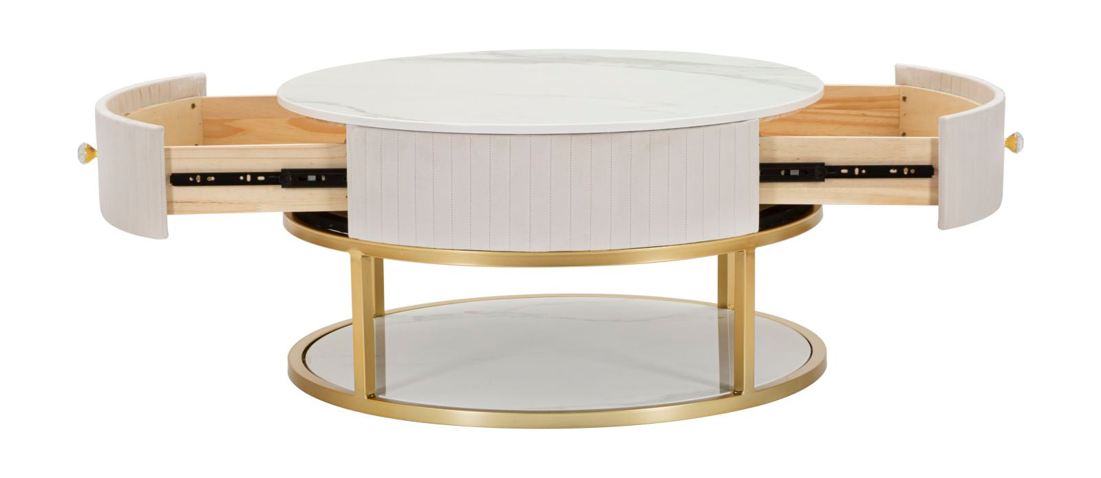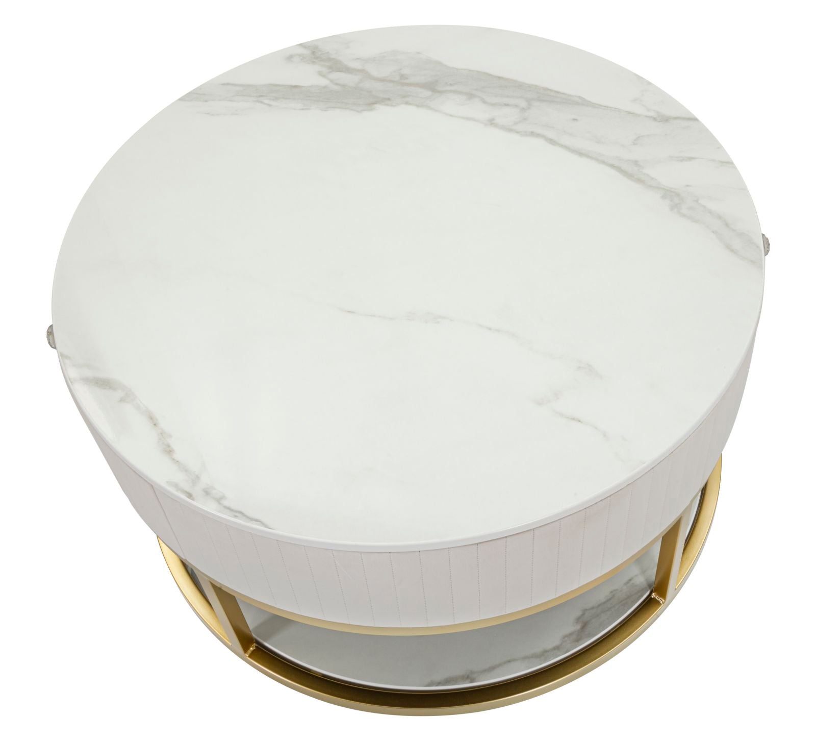 Tavolo da caff¨¦ rotondo con struttura in metallo dorato con top e ripiano in simil marmo e cassetto. La parte superiore ¨¨ rivestita in tessuto imbottito color crema. L'insieme crea un elegante combinazione che pu¨° essere abbinata a qualsiasi tipologia di arredo.