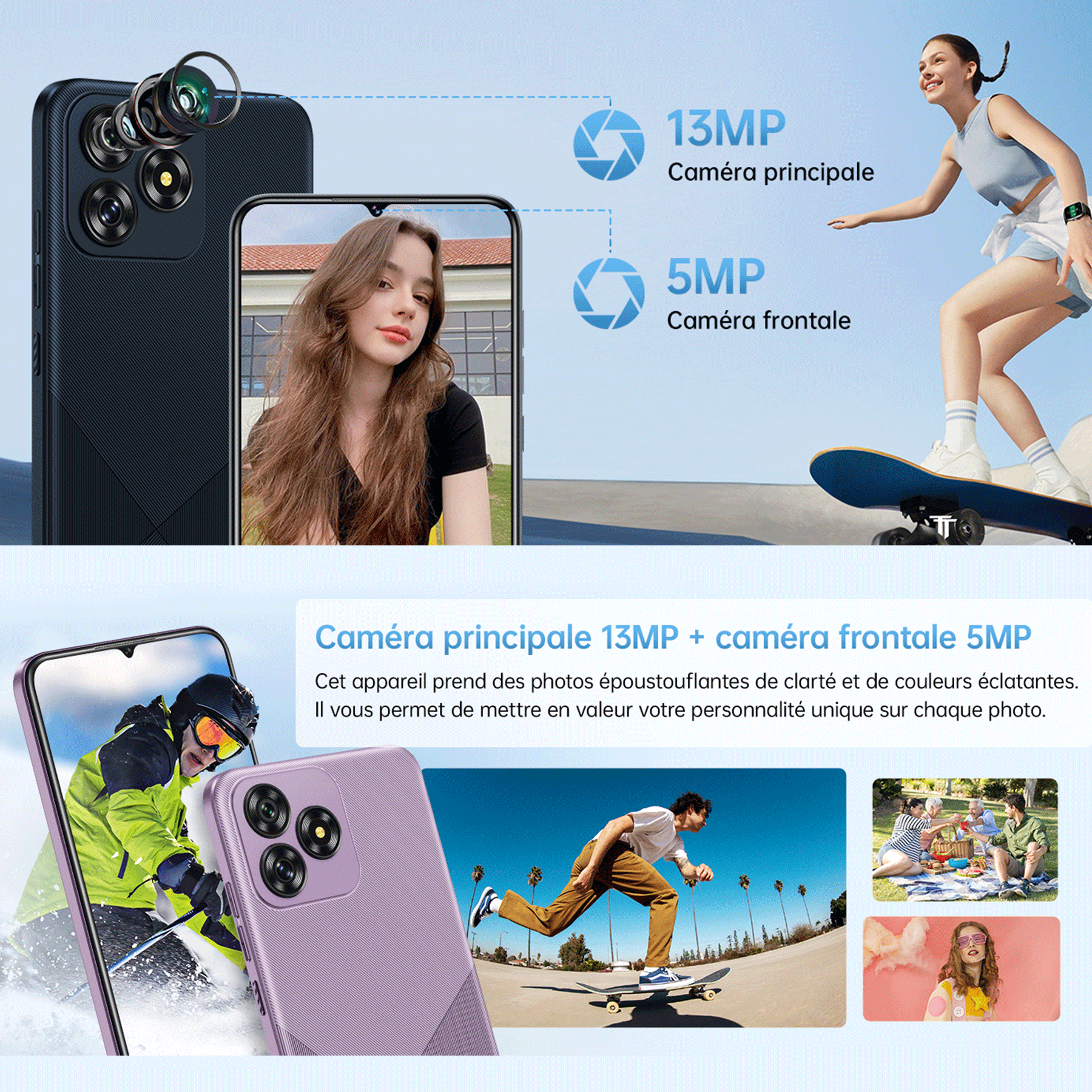 T¨¦l¨¦phones mobiles C53 2024, 6.6" HD+ Waterdrop Screen Android 14 t¨¦l¨¦phone, smartphone 4300mAh, 8GB + 64GB/1TB Octa Core, appareil photo principal 13MP, 4G Dual SIM Free d¨¦verrouill¨¦, Face ID/GPS/3.5mm Jack