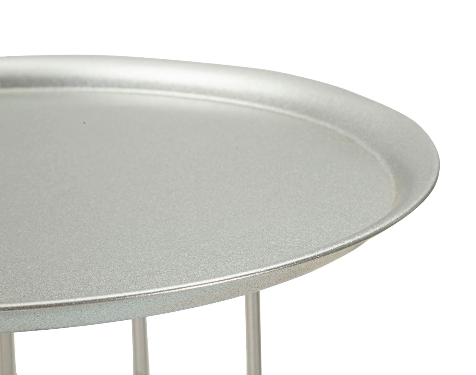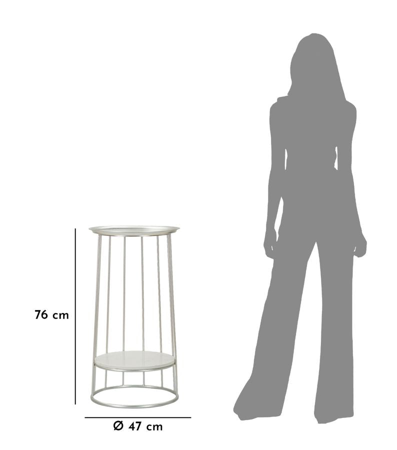 Tavolinetto elegante con base in metallo argentato e top in marmo. La base, un intreccio di linee che si incontrano, racconta una storia di connessione e armonia.