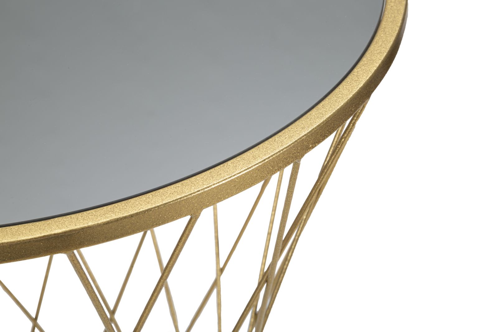 Tavolinetto rotondo in metallo dorato dalla struttura semplice e dalle linee essenziali con piano in vetro a specchio.