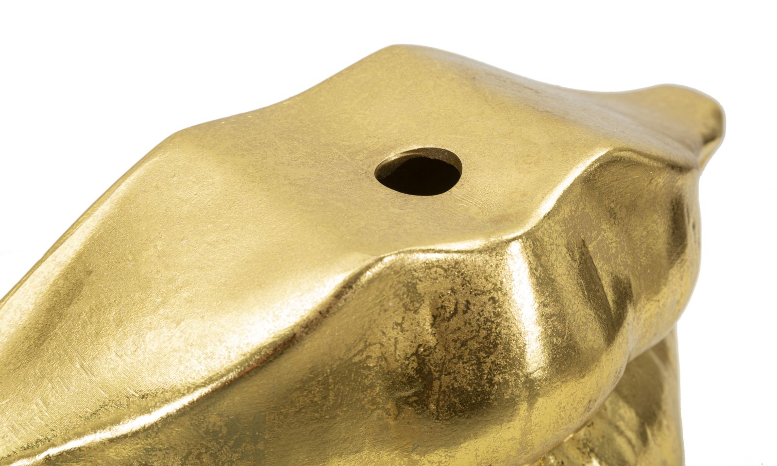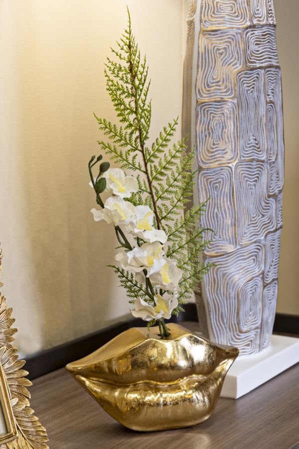 Elegante vaso in resina dorata a forma di labbra che sorridono.
