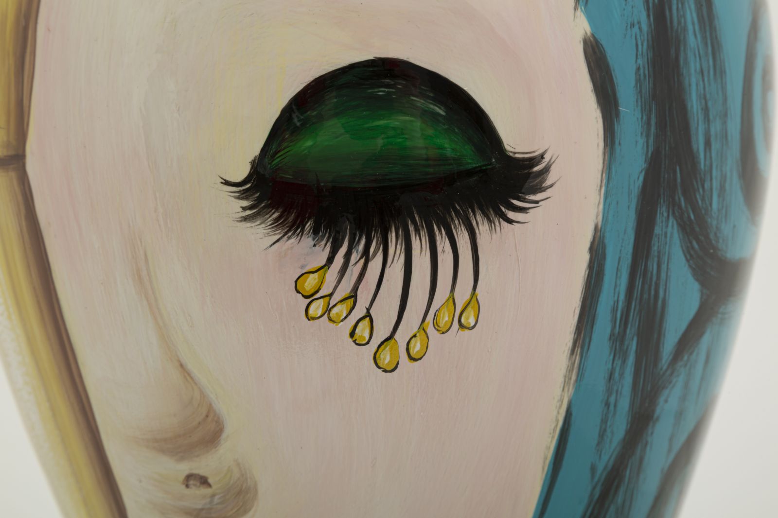 Vaso in ceramica dipinta raffigurante un volto dai tratti cubisti e impreziosito da decorazioni dorate.