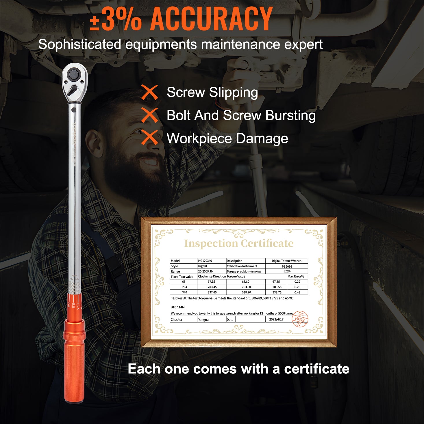 Mesures précises: Notre clé dynamométrique mécanique de 1/2 "offre une plage de couple de 25 à 250 pi. lb / 34 à 340 n.m, offrant une précision exceptionnelle allant jusqu'à ± 3%. Les certificats d'étalonnage accompagnent chaque jeu de clés dynamométriques, garantissant que vous pouvez serrer les fixations en toute confiance et avec précision sur votre véhicule ou votre équipement sans subir de dommages.