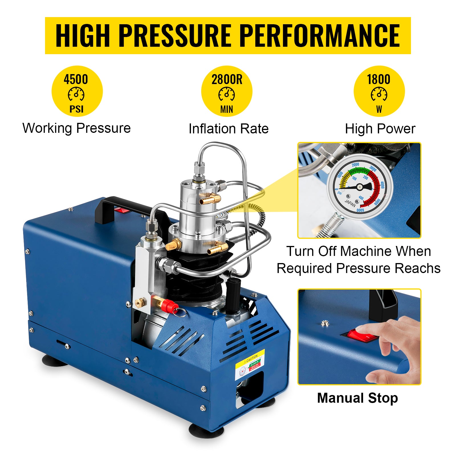 - Haute Pression : Notre compresseur d'air PCP est compos¨¦ de fils de cuivre et d'un moteur de 1800W. Il peut produire une haute pression rapidement et efficacement avec une pression maximale de 300BAR/30MPA/4500PSI. Veuillez noter que vous devez arr¨ºter la machine manuellement lorsque la pression requise est atteinte.