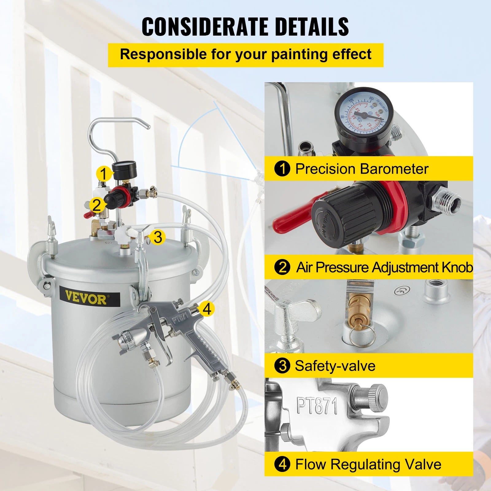 ¡¾Pot de peinture ¨¤ pression¡¿: Le pulv¨¦risateur de peinture est un pulv¨¦risateur facile ¨¤ utiliser qui applique une finition lisse sans marques de pinceau. Parfait pour peindre de grands projets comme l'ext¨¦rieur de la maison, les cl?tures, les terrasses, les garages, les meubles, les garnitures et plus encore. Il peut ¨¦galement pulv¨¦riser diverses ¨¦mulsions, latex, ¨¦mail, appr¨ºt, mastic transparent et vernis.